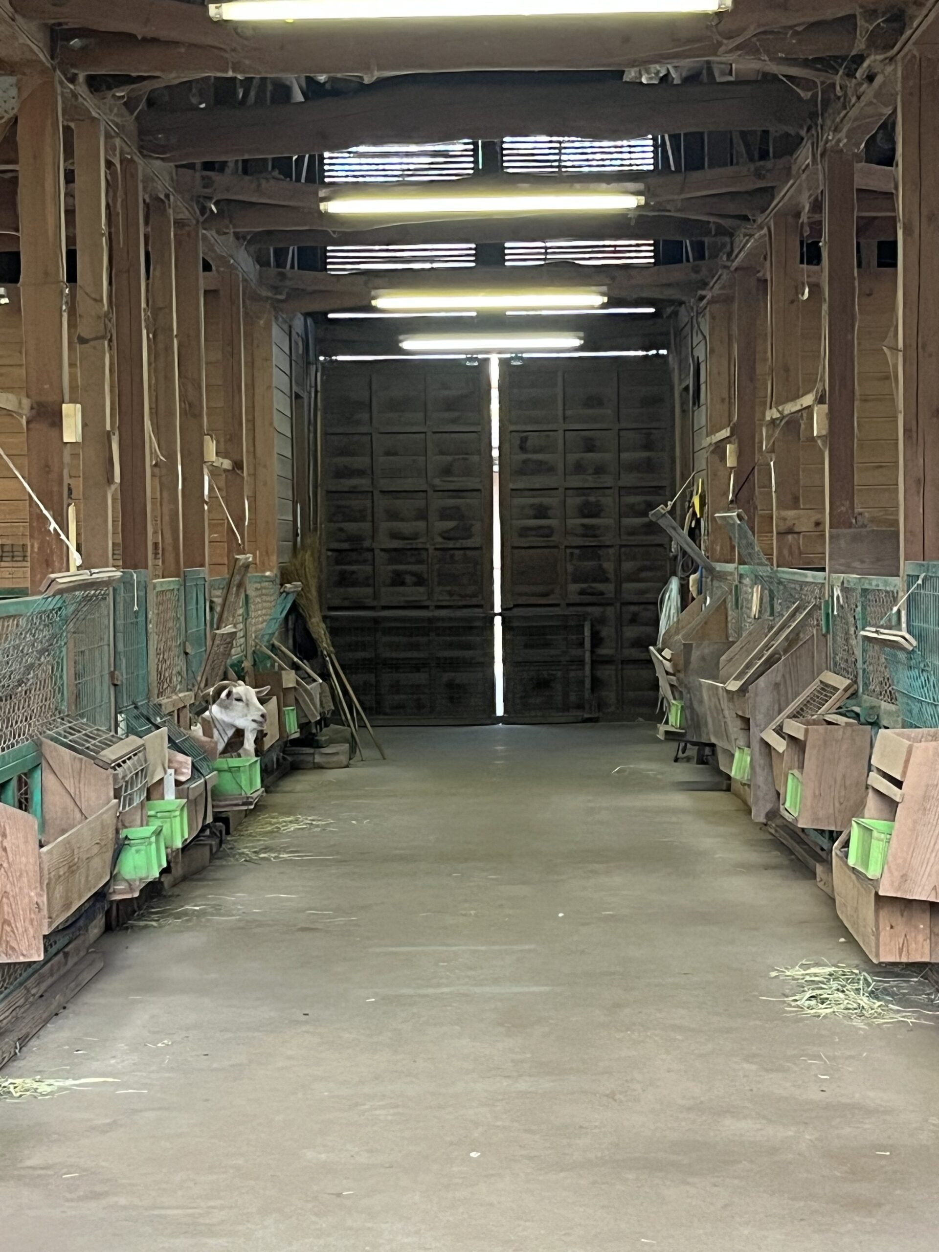 シェーブル館から少し移動すると蕎麦打ち体験などが出来る施設があります。そのそばに大きなヤギ小屋やうさぎ小屋があるのです。