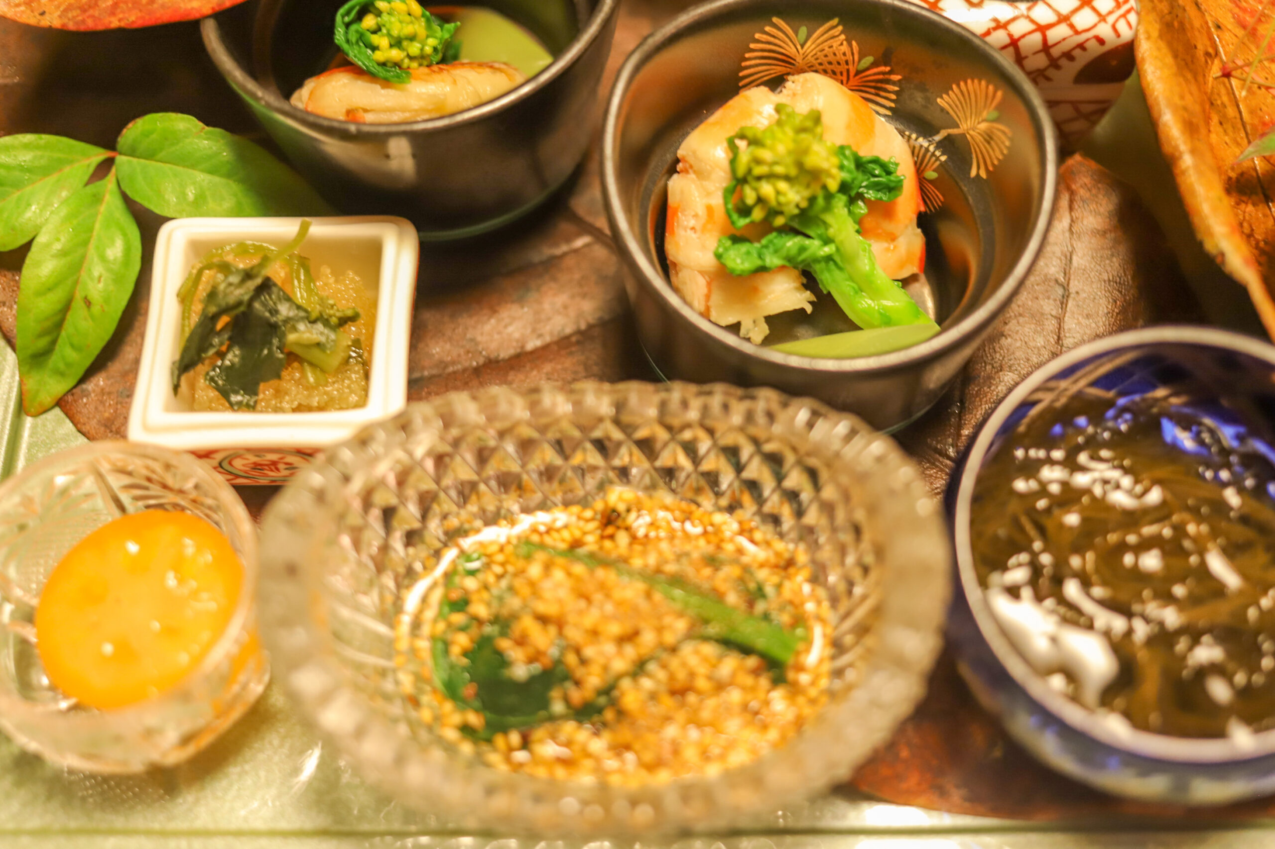 様々な小鉢が1つのお皿にのっている八寸。1つお皿に二人分の八寸がのって運ばれてきます。
