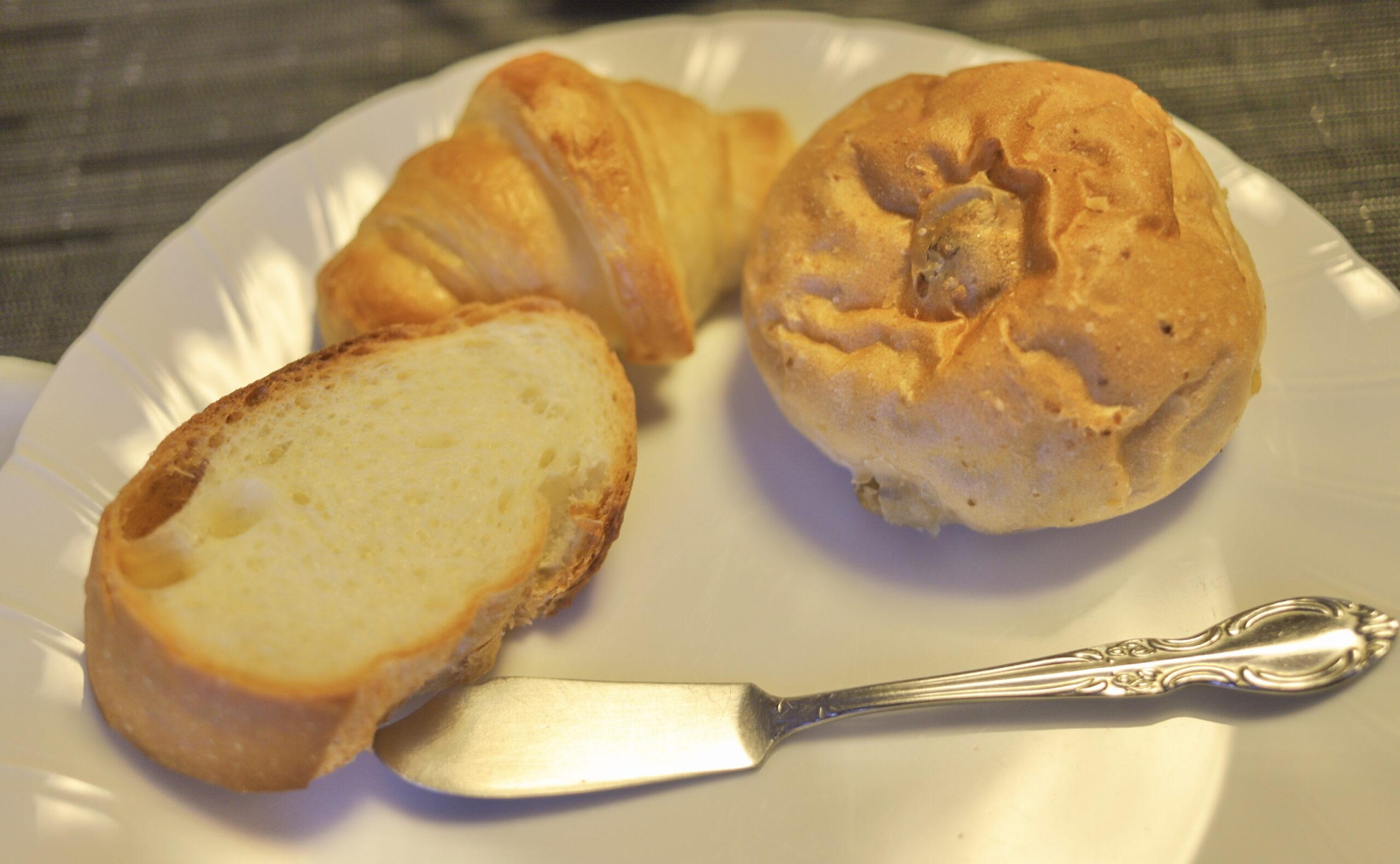メインのパンはフランスパン、クロワッサン、くるみパンの3種類です!どのパンのおかわり自由ですよ~!